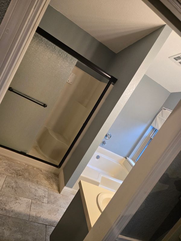 Outdated bath with wall partition separating the shower enclosure from the garden tub.